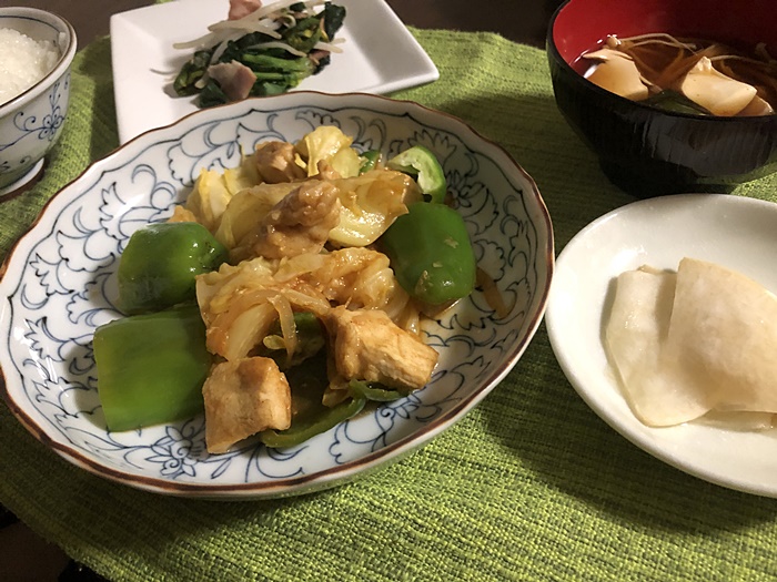 後は味噌汁もつけて4品、一人分140円程の夕食。