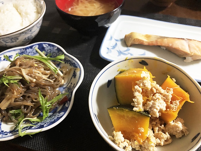 サブのおかずはかぼちゃと鶏ミンチで。