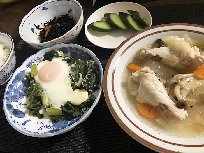 参鶏湯とひじきの煮物、とても美味しそうです。
