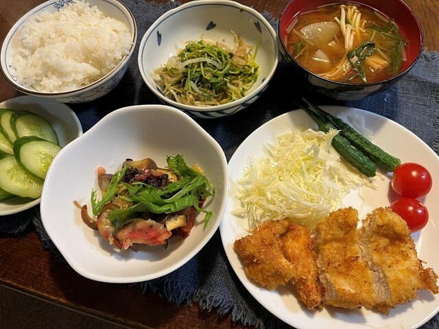 もう1品は豆苗とモヤシを湯がいてポン酢、おかかであえた物。