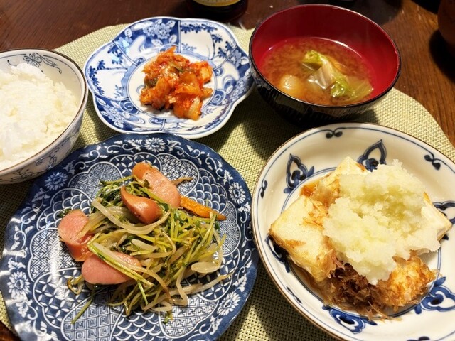 後は市販のキムチ、野菜たっぷり味噌汁もつけて