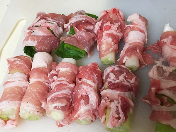 こんなこま切れ肉で白ネギを巻いて~